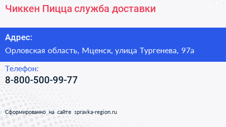 Чиккен Пицца, служба доставки по адресу Орловская область, Мценск, улица Тургенева, 97а в дальнейшем Организация, размещена в следующих категориях: