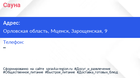 Сауна по адресу Орловская область, Мценск, Зарощенская, 9 в дальнейшем Организация, размещена в следующих категориях: