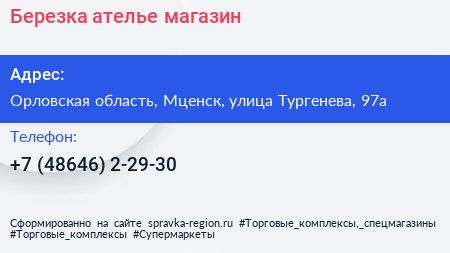 Березка, ателье-магазин по адресу Орловская область, Мценск, улица Тургенева, 97а в дальнейшем Организация, размещена в следующих категориях: