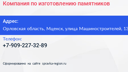 Компания по изготовлению памятников по адресу Орловская область, Мценск, улица Машиностроителей, 13 в дальнейшем Организация, размещена в следующих категориях:
