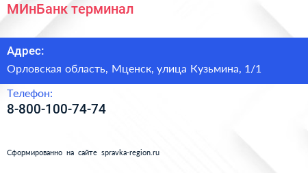 МИнБанк, терминал по адресу Орловская область, Мценск, улица Кузьмина, 1/1 в дальнейшем Организация, размещена в следующих категориях: