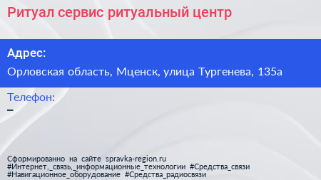 Ритуал-сервис, ритуальный центр по адресу Орловская область, Мценск, улица Тургенева, 135а в дальнейшем Организация, размещена в следующих категориях: