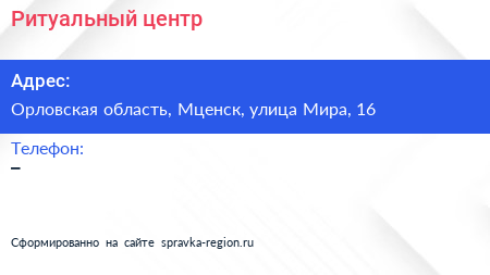 Ритуальный центр по адресу Орловская область, Мценск, улица Мира, 16 в дальнейшем Организация, размещена в следующих категориях: