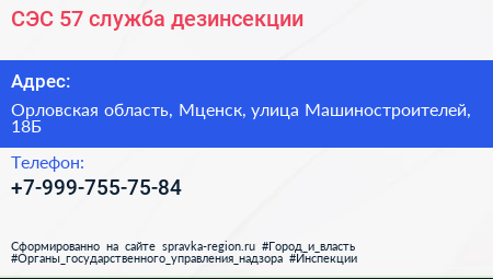 СЭС №57, служба дезинсекции по адресу Орловская область, Мценск, улица Машиностроителей, 18Б в дальнейшем Организация, размещена в следующих категориях: