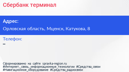 Сбербанк, терминал по адресу Орловская область, Мценск, Катукова, 8 в дальнейшем Организация, размещена в следующих категориях: