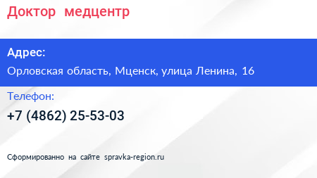 Доктор+, медцентр по адресу Орловская область, Мценск, улица Ленина, 16 в дальнейшем Организация, размещена в следующих категориях: