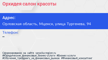 Орхидея, салон красоты по адресу Орловская область, Мценск, улица Тургенева, 94 в дальнейшем Организация, размещена в следующих категориях: