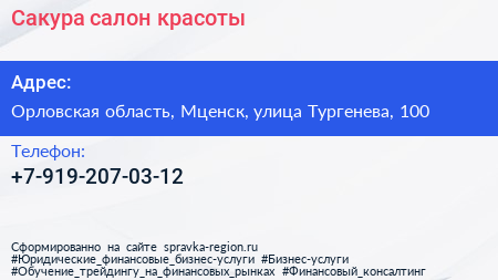 Сакура, салон красоты по адресу Орловская область, Мценск, улица Тургенева, 100 в дальнейшем Организация, размещена в следующих категориях: