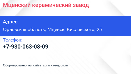 Мценский керамический завод по адресу Орловская область, Мценск, Кисловского, 25 в дальнейшем Организация, размещена в следующих категориях: