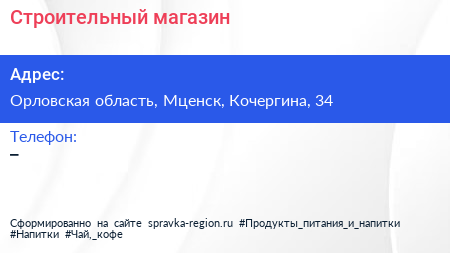 Строительный магазин по адресу Орловская область, Мценск, Кочергина, 34 в дальнейшем Организация, размещена в следующих категориях: