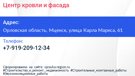 Центр кровли и фасада по адресу Орловская область, Мценск, улица Карла Маркса, 61 в дальнейшем Организация, размещена в следующих категориях: