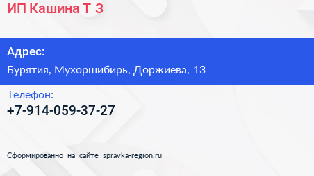 ИП Кашина Т.З. по адресу Бурятия, Мухоршибирь, Доржиева, 13 в дальнейшем Организация, размещена в следующих категориях: