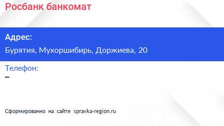 Росбанк, банкомат по адресу Бурятия, Мухоршибирь, Доржиева, 20 в дальнейшем Организация, размещена в следующих категориях: