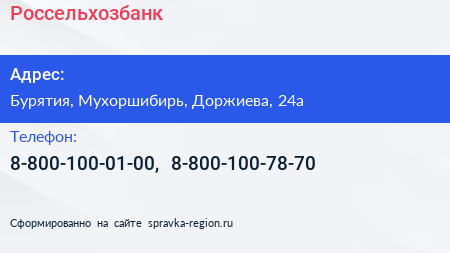 Россельхозбанк по адресу Бурятия, Мухоршибирь, Доржиева, 24а в дальнейшем Организация, размещена в следующих категориях:
