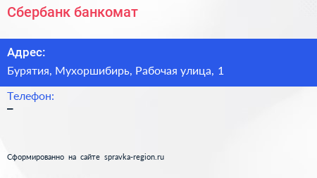 Сбербанк, банкомат по адресу Бурятия, Мухоршибирь, Рабочая улица, 1 в дальнейшем Организация, размещена в следующих категориях: