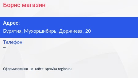 Борис, магазин по адресу Бурятия, Мухоршибирь, Доржиева, 20 в дальнейшем Организация, размещена в следующих категориях: