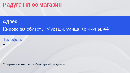 Радуга Плюс, магазин по адресу Кировская область, Мураши, улица Коммуны, 44 в дальнейшем Организация, размещена в следующих категориях: