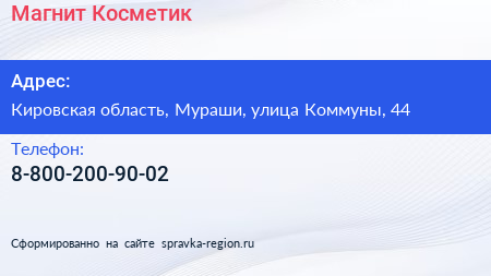 Магнит Косметик по адресу Кировская область, Мураши, улица Коммуны, 44 в дальнейшем Организация, размещена в следующих категориях: