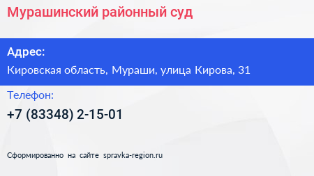Мурашинский районный суд по адресу Кировская область, Мураши, улица Кирова, 31 в дальнейшем Организация, размещена в следующих категориях: