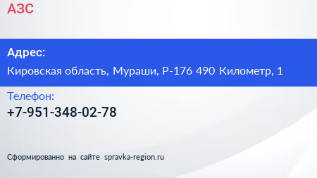 АЗС по адресу Кировская область, Мураши, Р-176 490 Километр, 1 в дальнейшем Организация, размещена в следующих категориях: