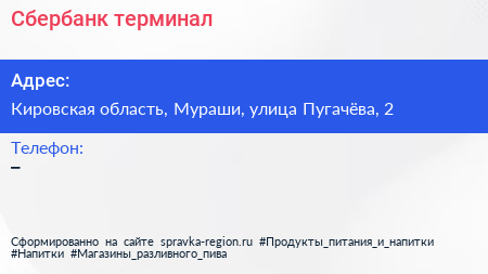 Сбербанк, терминал по адресу Кировская область, Мураши, улица Пугачёва, 2 в дальнейшем Организация, размещена в следующих категориях:
