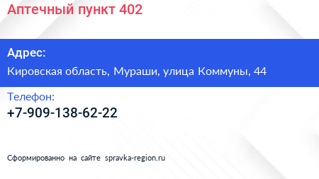 Аптечный пункт №402 по адресу Кировская область, Мураши, улица Коммуны, 44 в дальнейшем Организация, размещена в следующих категориях: