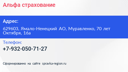 Альфа страхование по адресу 629603, Ямало-Ненецкий АО, Муравленко, 70 лет Октября, 16а в дальнейшем Организация, размещена в следующих категориях: