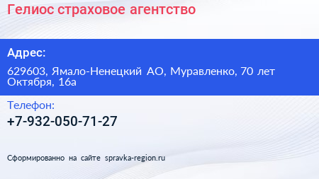 Гелиос, страховое агентство по адресу 629603, Ямало-Ненецкий АО, Муравленко, 70 лет Октября, 16а в дальнейшем Организация, размещена в следующих категориях: