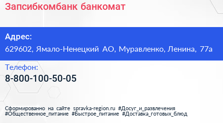 Запсибкомбанк, банкомат по адресу 629602, Ямало-Ненецкий АО, Муравленко, Ленина, 77а в дальнейшем Организация, размещена в следующих категориях: