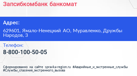 Запсибкомбанк, банкомат по адресу 629601, Ямало-Ненецкий АО, Муравленко, Дружбы Народов, 3 в дальнейшем Организация, размещена в следующих категориях: