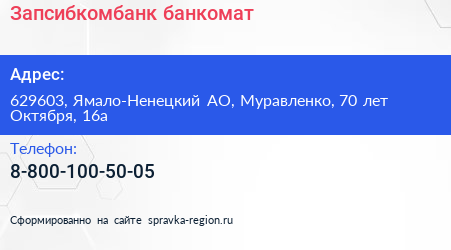 Запсибкомбанк, банкомат по адресу 629603, Ямало-Ненецкий АО, Муравленко, 70 лет Октября, 16а в дальнейшем Организация, размещена в следующих категориях: