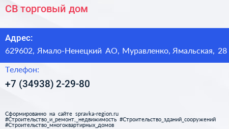 СВ, торговый дом по адресу 629602, Ямало-Ненецкий АО, Муравленко, Ямальская, 28 в дальнейшем Организация, размещена в следующих категориях: