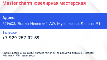 Master charm, ювелирная мастерская по адресу 629603, Ямало-Ненецкий АО, Муравленко, Ленина, 91 в дальнейшем Организация, размещена в следующих категориях: