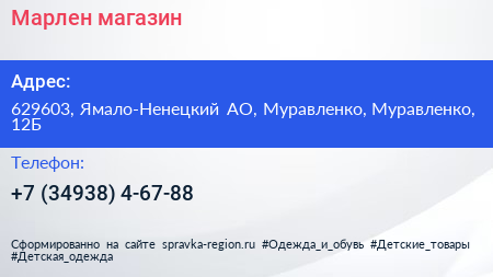 Марлен, магазин по адресу 629603, Ямало-Ненецкий АО, Муравленко, Муравленко, 12Б в дальнейшем Организация, размещена в следующих категориях: