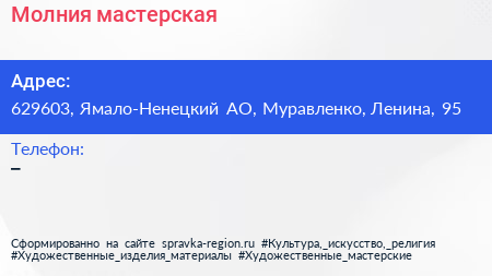 Молния, мастерская по адресу 629603, Ямало-Ненецкий АО, Муравленко, Ленина, 95 в дальнейшем Организация, размещена в следующих категориях: