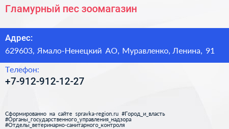 Гламурный пес, зоомагазин по адресу 629603, Ямало-Ненецкий АО, Муравленко, Ленина, 91 в дальнейшем Организация, размещена в следующих категориях:
