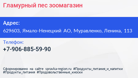 Гламурный пес, зоомагазин по адресу 629603, Ямало-Ненецкий АО, Муравленко, Ленина, 113 в дальнейшем Организация, размещена в следующих категориях: