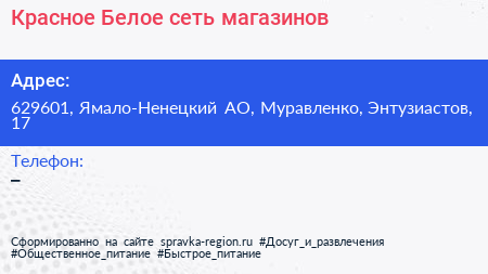 Красное & Белое, сеть магазинов по адресу 629601, Ямало-Ненецкий АО, Муравленко, Энтузиастов, 17 в дальнейшем Организация, размещена в следующих категориях: