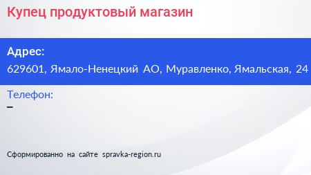 Купец, продуктовый магазин по адресу 629601, Ямало-Ненецкий АО, Муравленко, Ямальская, 24 в дальнейшем Организация, размещена в следующих категориях: