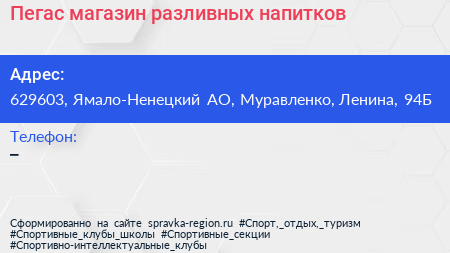 Пегас, магазин разливных напитков по адресу 629603, Ямало-Ненецкий АО, Муравленко, Ленина, 94Б в дальнейшем Организация, размещена в следующих категориях: