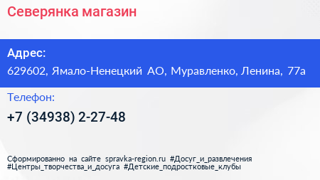 Северянка, магазин по адресу 629602, Ямало-Ненецкий АО, Муравленко, Ленина, 77а в дальнейшем Организация, размещена в следующих категориях: