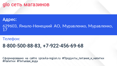 glo, сеть магазинов по адресу 629603, Ямало-Ненецкий АО, Муравленко, Муравленко, 17 в дальнейшем Организация, размещена в следующих категориях:
