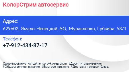 КолорСтрим, автосервис по адресу 629602, Ямало-Ненецкий АО, Муравленко, Губкина, 53/1 в дальнейшем Организация, размещена в следующих категориях: