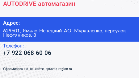 AUTODRIVE, автомагазин по адресу 629601, Ямало-Ненецкий АО, Муравленко, переулок Нефтяников, 8 в дальнейшем Организация, размещена в следующих категориях: