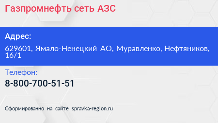 Газпромнефть, сеть АЗС по адресу 629601, Ямало-Ненецкий АО, Муравленко, Нефтяников, 16/1 в дальнейшем Организация, размещена в следующих категориях: