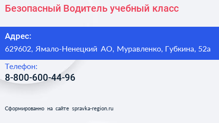 Безопасный Водитель, учебный класс по адресу 629602, Ямало-Ненецкий АО, Муравленко, Губкина, 52а в дальнейшем Организация, размещена в следующих категориях: