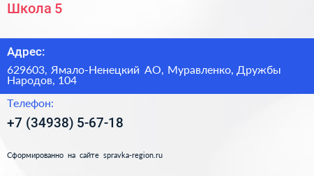 Школа №5 по адресу 629603, Ямало-Ненецкий АО, Муравленко, Дружбы Народов, 104 в дальнейшем Организация, размещена в следующих категориях: