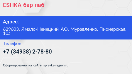 ESHKA, бар-паб по адресу 629603, Ямало-Ненецкий АО, Муравленко, Пионерская, 10а в дальнейшем Организация, размещена в следующих категориях: