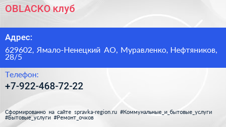 OBLACKO, клуб по адресу 629602, Ямало-Ненецкий АО, Муравленко, Нефтяников, 28/5 в дальнейшем Организация, размещена в следующих категориях: