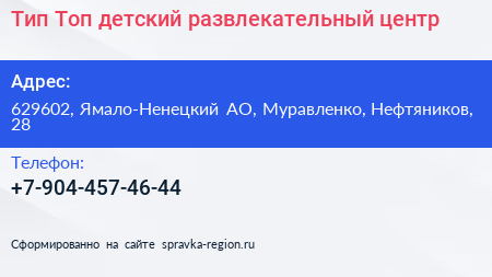 Тип-Топ, детский развлекательный центр по адресу 629602, Ямало-Ненецкий АО, Муравленко, Нефтяников, 28 в дальнейшем Организация, размещена в следующих категориях: